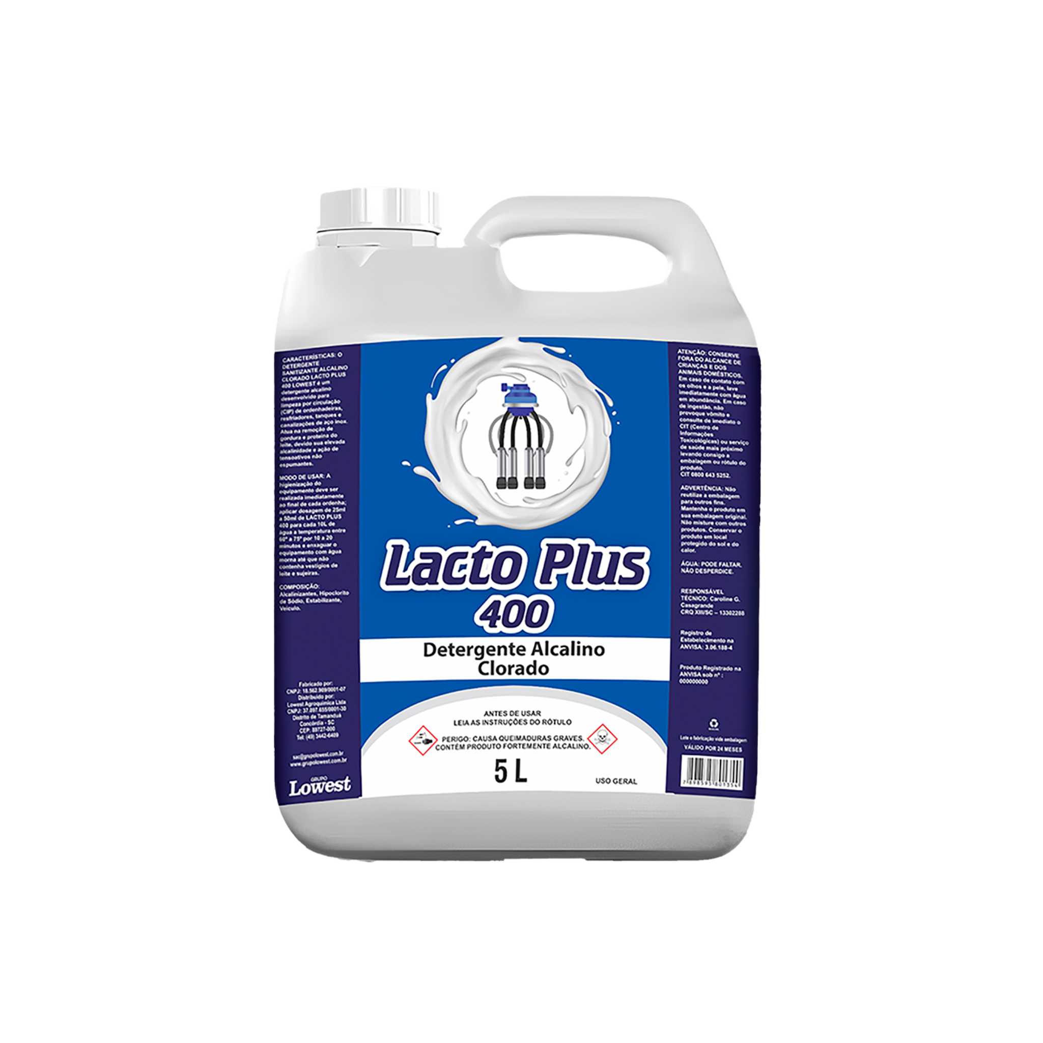 O DETERGENTE SANITIZANTE ALCALINO CLORADO LACTO PLUS 400 LOWEST é um detergente alcalino desenvolvido para limpeza por circulação (CIP) de ordenhadeiras, resfriadores, tanques e canalizações de aço inox. Atua na remoção do leite, devido sua elevada alcalinidade e ação de tensoativos não espumantes.