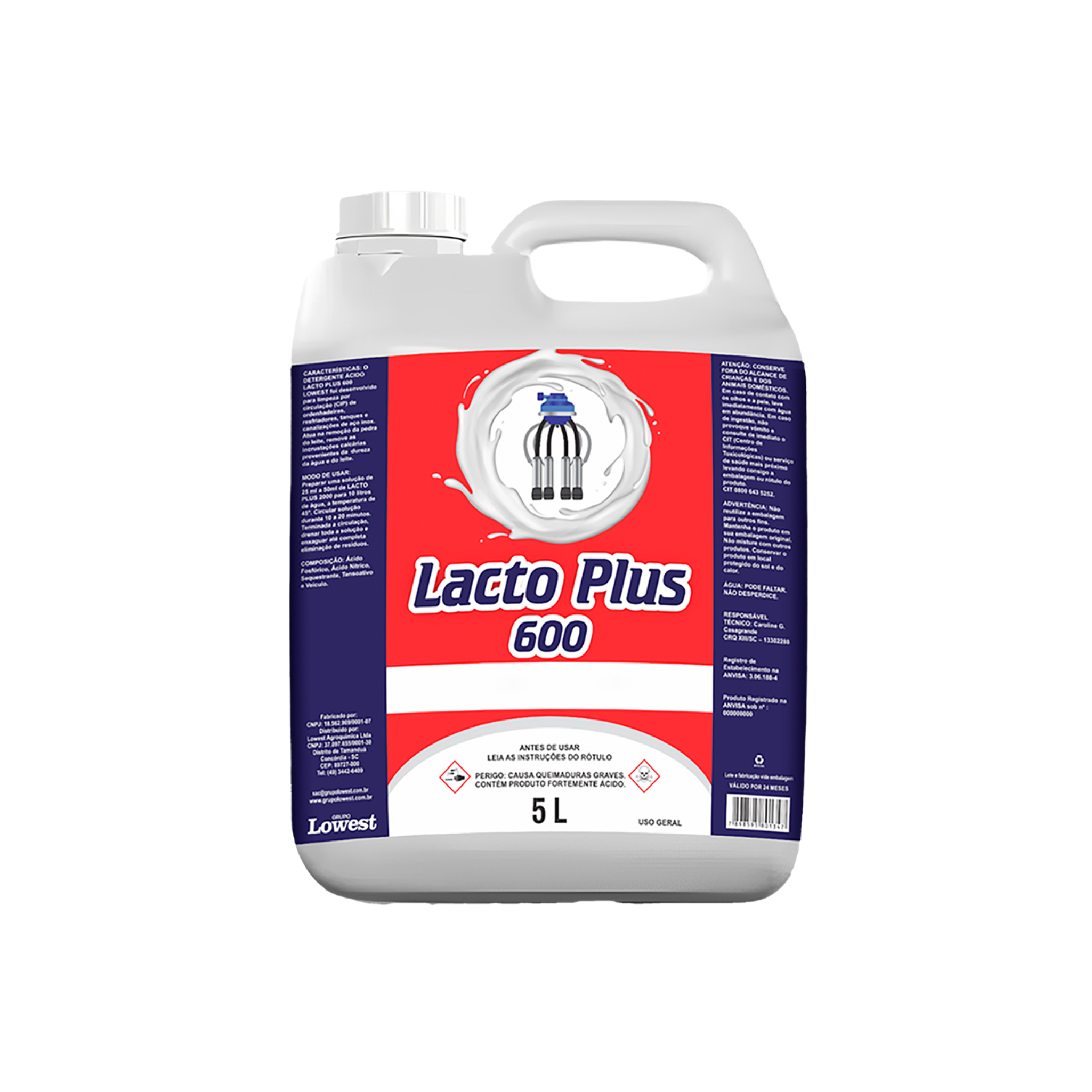 O DETERGENTE ÁCIDO LACTO PLUS 600 LOWEST foi desenvolvido para limpeza por circulação (CIP) de ordenhadeiras, resfriadores, tanques e canalizações de aço inox. Atua na remoção de pedra do leite, remove as incrustações calcárias provenientes da dureza da água e do leite.