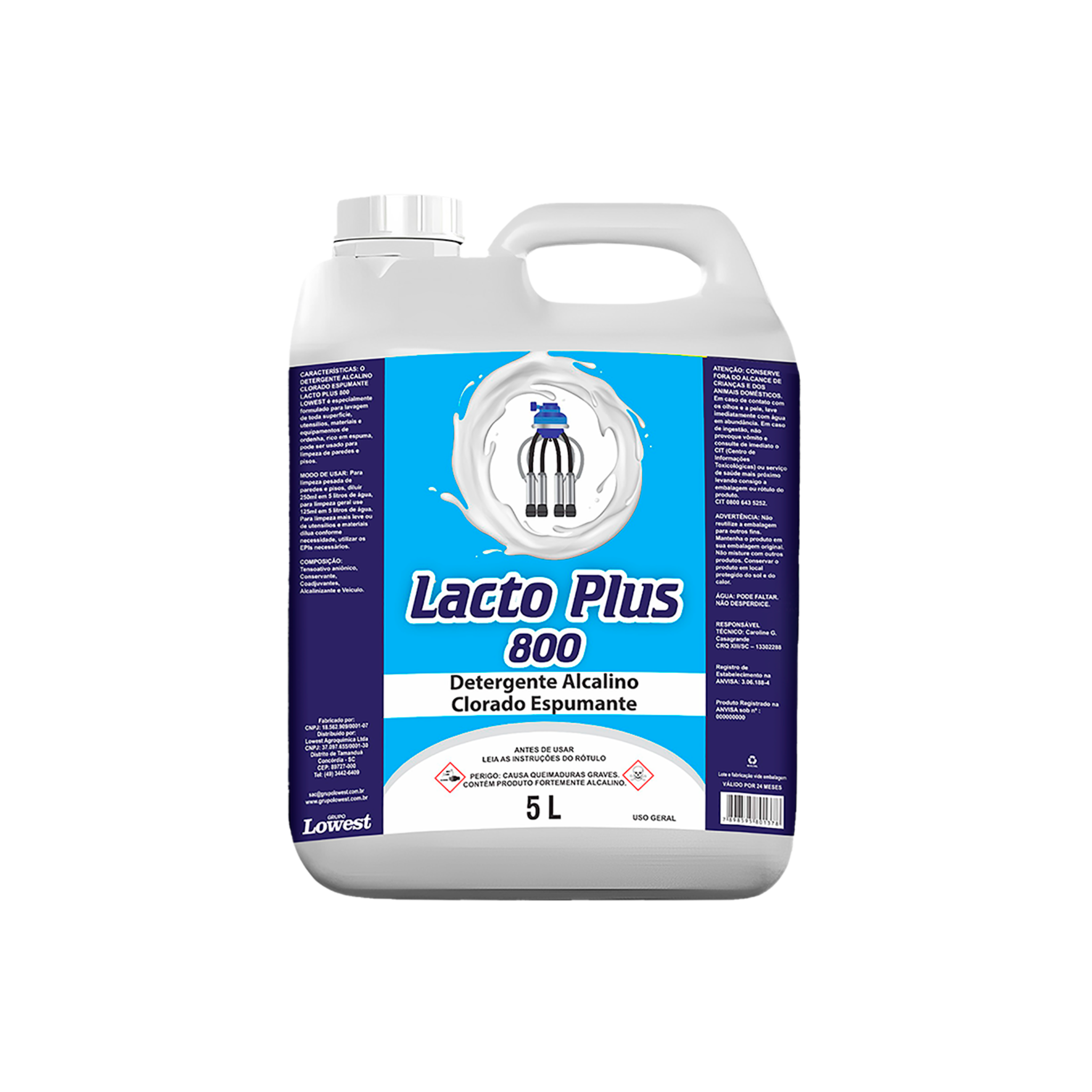 O DETERGENTE ALCALINO CLORADO ESPUMANTE LACTO PLUS 800 LOWEST é especialmente formulado para lavagem de toda superfície, utensílios, materiais e equipamentos de ordenha, rico em espuma, pode ser usado para limpeza de paredes e pisos.